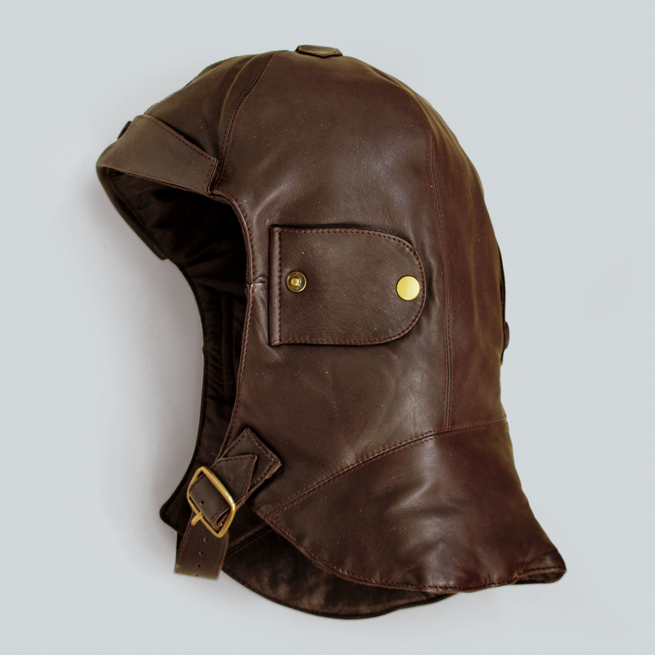 Das Obermaterial ist handschuhweiches Leder. Die Haube ist leicht wattiert und innen mit einem Stoff aus Baumwoll/Seide/Viscose Gemisch gefüttert. Die Sonnenblende über den Augen ist knöpfbar, ebenso wie die Abdeckungen über den Ohren. Der Kinnriemen ist natürlich verstellbar und hat auf einer Seite einen Druckknopf.