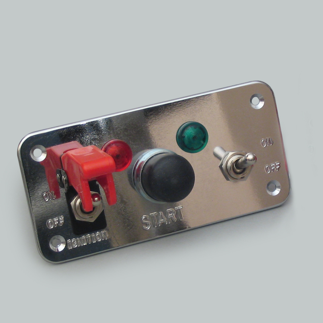 Auf dieser verchromten Platte finden Sie einen Zündungsschalter mit Sicherheitsklappe, einen wassergeschützten Starterknopf und eine Zündkontrolleuchte und einen Zusatzschalter mit Kontrolleuchte. Die Platte ist drei Millimeter dick, die Befestigungslöcher sind gesenkt, und die Beschriftungen sind graviert.