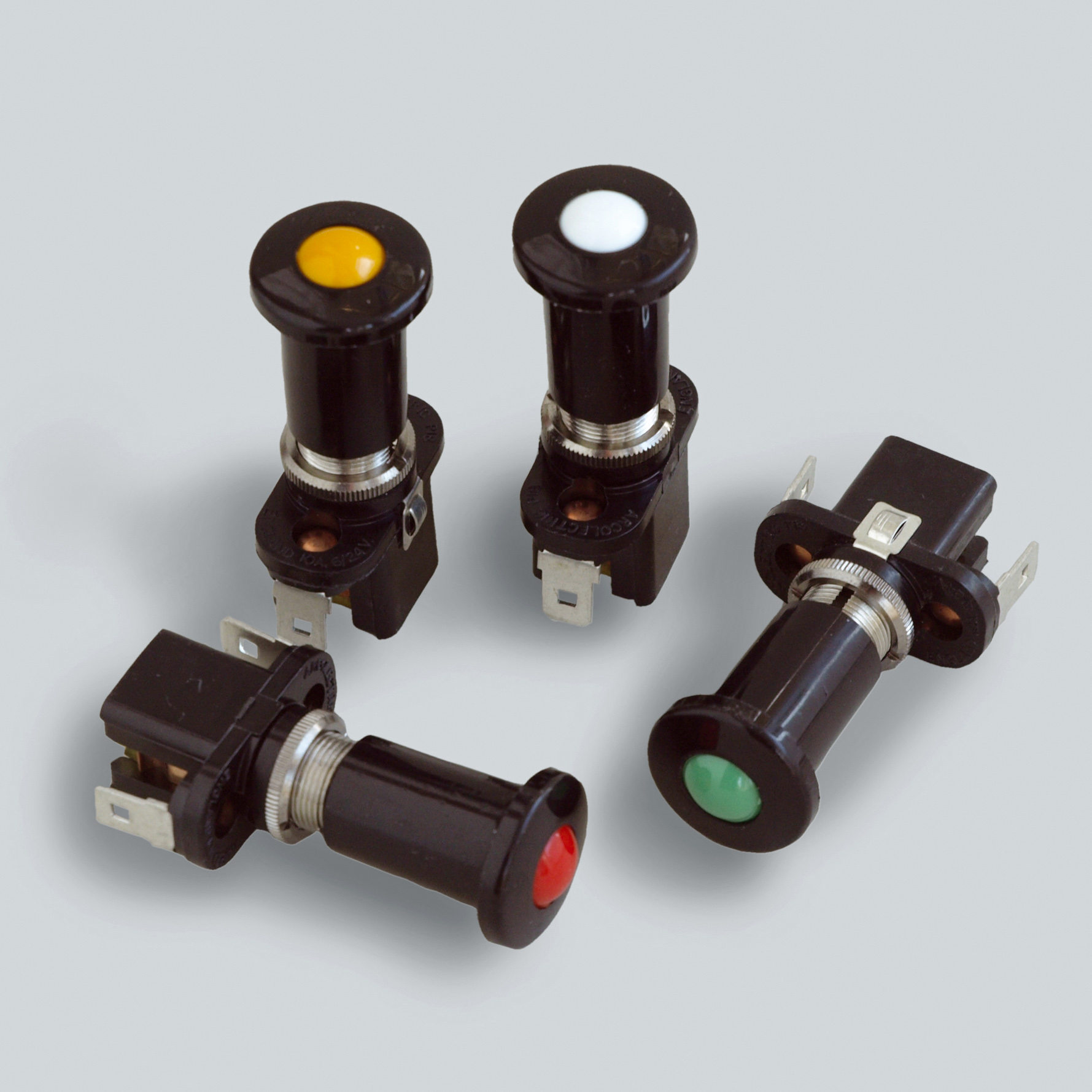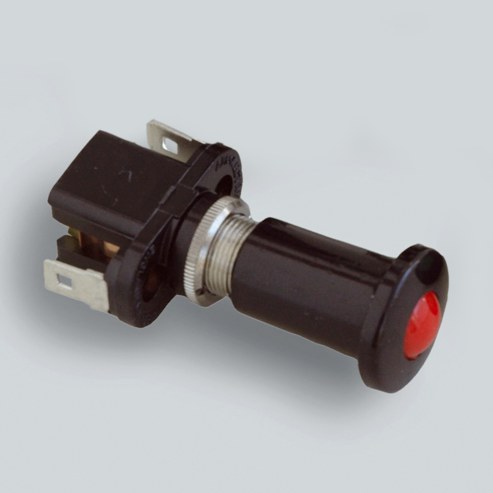 Die Zugknöpfe sind aus glänzendem Hartkunststoff, der gut zu anderen klassischen Schaltern paßt. Ein/aus Schalter mit Kontrolleuchte für 12 Volt. 6,3 mm Steckanschlüsse. Einbaumaß 12,5 mm, belastbar bis 10 A bei 12 Volt.