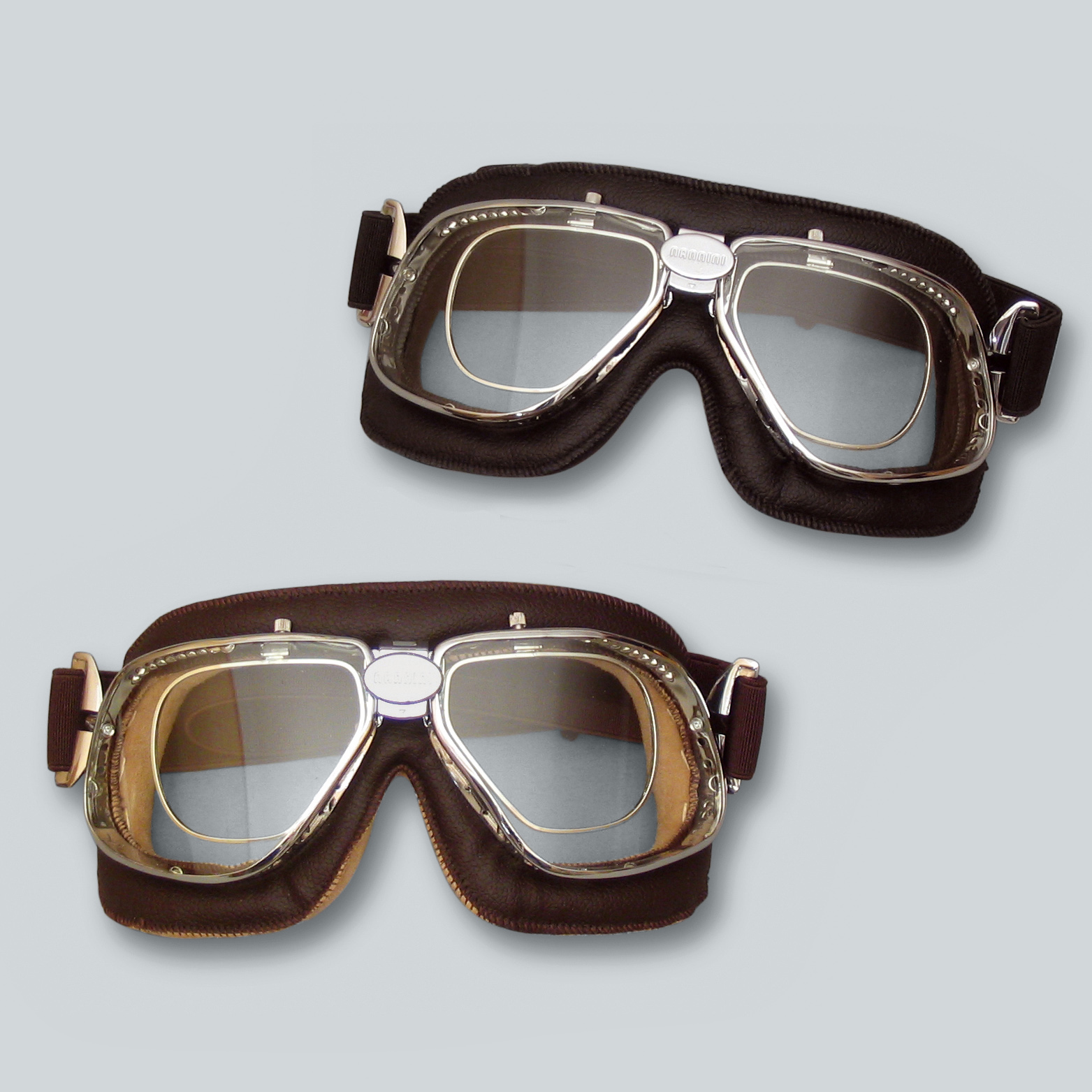 Eine besonders fein gearbeitete Fahrerbrille. Sie ist relativ groß und bietet daher ein großes Sichtfeld. Komplett aus Leder hergestellt, Gläser aus leichtem und beschlagfreiem Kunststoff, der breite Gummizug ist komfortabel. Austauschgläser aus grau getöntem Kunststoff liegen bei.