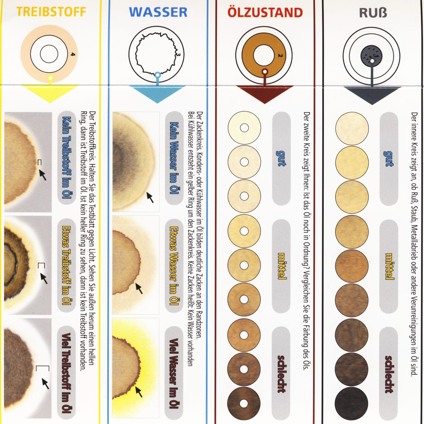 Man entnimmt dem betriebswarmen Motor einen Tropfen Motoröl und bringt ihn auf das Testpapier. Dort wird das Öl innerhalb weniger Stunden in verschiedene Fraktionen aufgespalten: Feststoffe, Öl, Wasser und Benzin. Die Farben und Mengen dieser Bestandteile können dann einzeln begutachtet und mit den beigefügten Tabellen verglichen werden. Man erhält so einen Einblick in den Wartungszustand des Motors und Hinweise auf mögliche Fehleinstellungen. Die ausführliche, bebilderte Anleitung ermöglicht auch dem Nicht-Fachmann eine genaue Analyse.