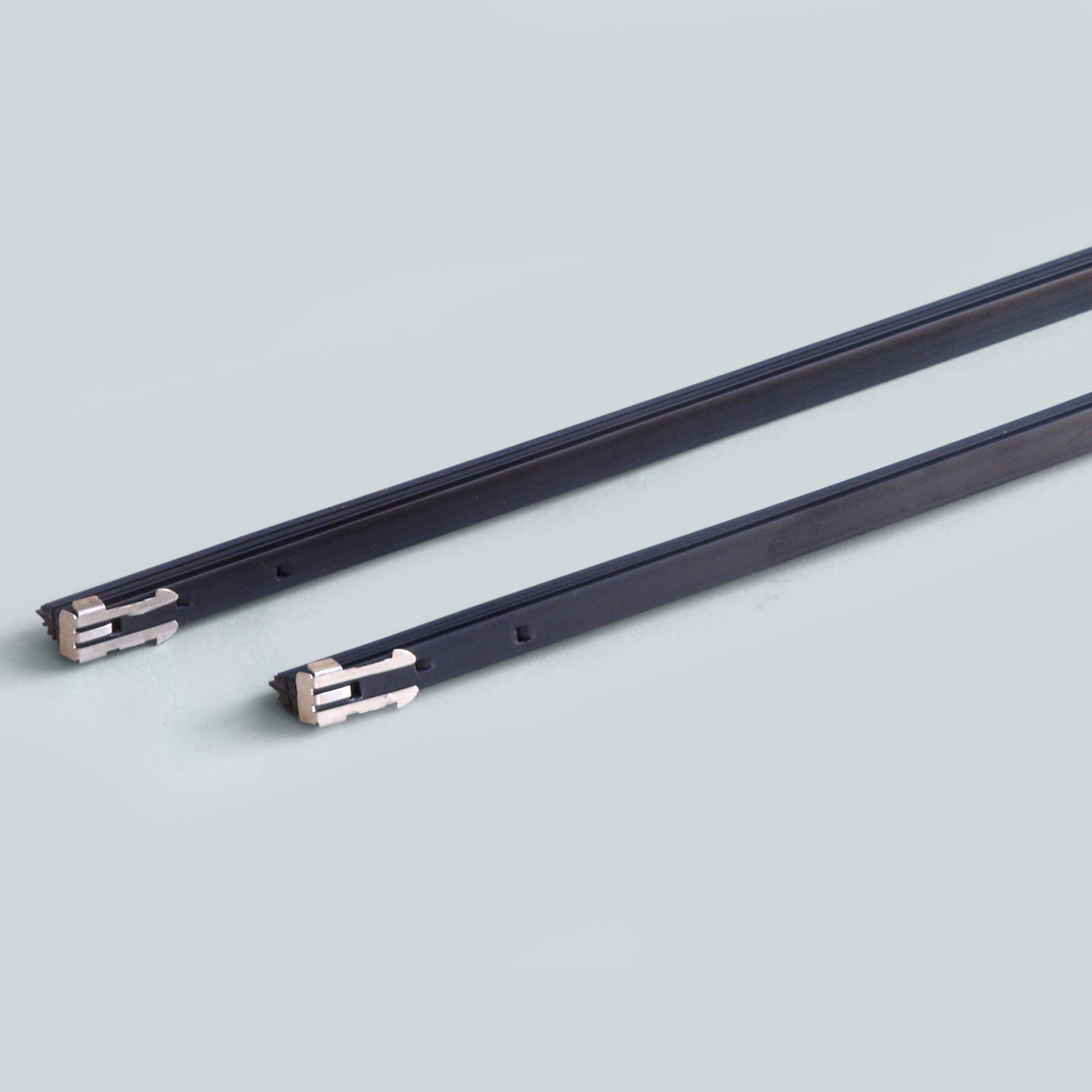 Die Blätter sind 61 cm lang und einfach zu montieren. Man zieht die Wischergummis der vorhandenen Wischerblätter heraus und zieht diese neuen Gummis ein. Die abgebildeten Metallkrallen sichern die neuen Gummis im alten Wischerblatt.
