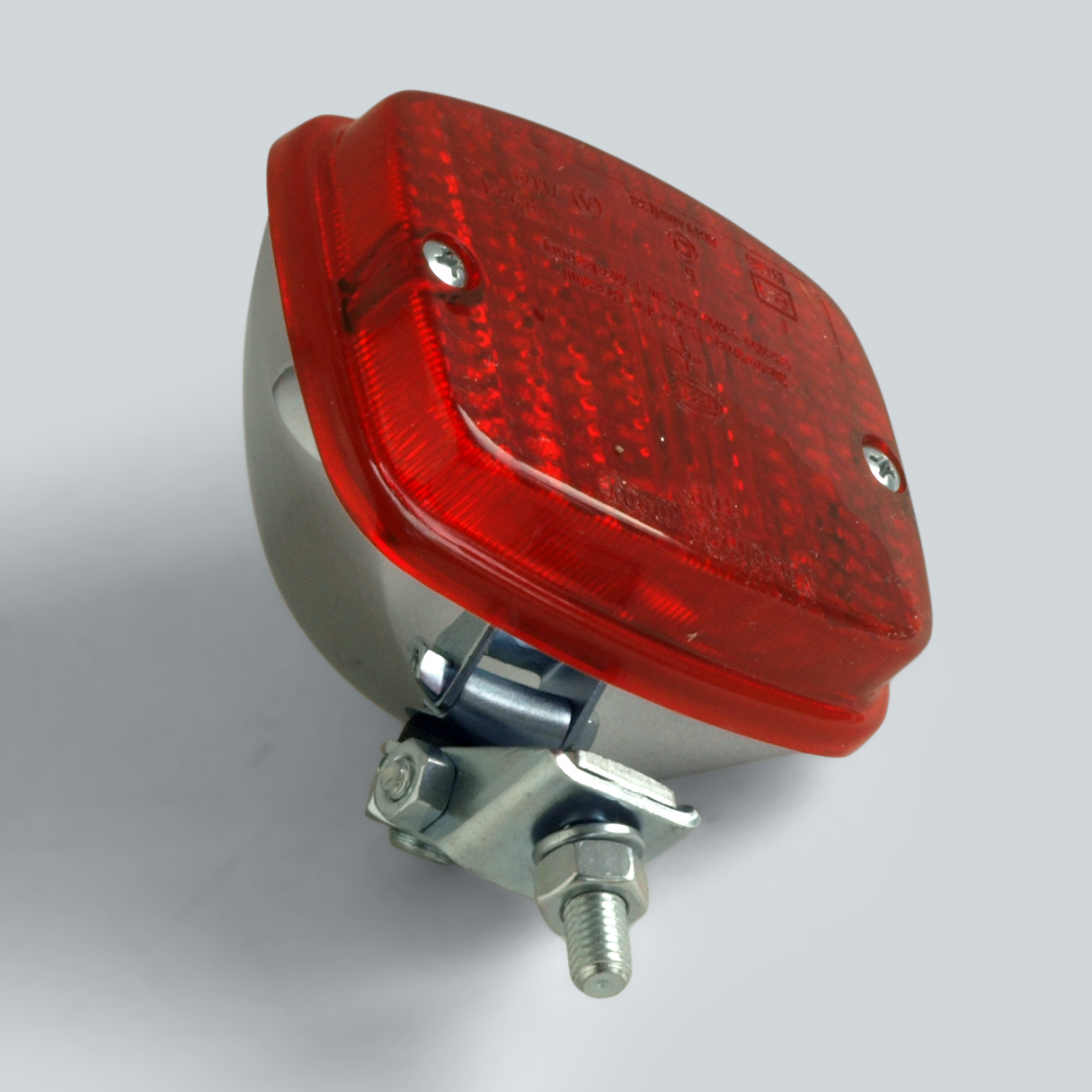 Blechgehäuse, verchromt, für 21 Watt BA15s Glühlampe (nicht enthalten). Die Leuchte trägt die E-Marke. Breite: 12,5 cm, Höhe 7,5 cm, 6,5 cm tief. Rotes Kunststoffglas. Für stehenden oder hängenden Anbau an waagerechten oder senkrechten Flächen